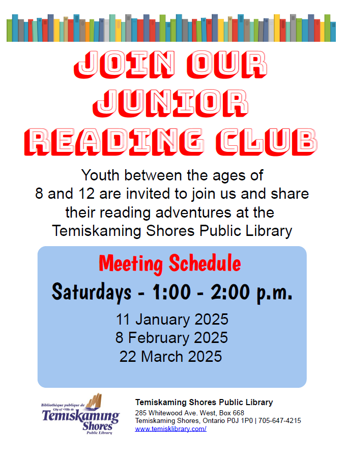 The Temiskaming Shores Public Library has a Junior Reading Club. This is a group of young people between the ages of 8 and 12 who enjoy reading and like to book-talk about what they’re reading without giving away any spoilers. This is a great way to...