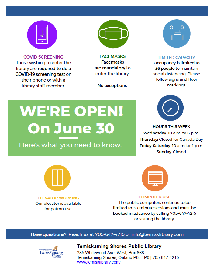 On June 30, 2021 the Library will be reopening to the public, as allowed in Step 2 of the Province's Reopening Plan. We are operating on modified hours for this week, but will be back to regular hours of operation the week of July 5. Visitors must wear a mask to enter, and must screen for COVID-19 symptoms using the QR code in the lobby or with the help of a staff person. Physical distancing of two metres and sanitizing hands on entry and exit are required as well. If you are not able to wear a mask please contact us and we can arrange for you to pick up your items at the door.
