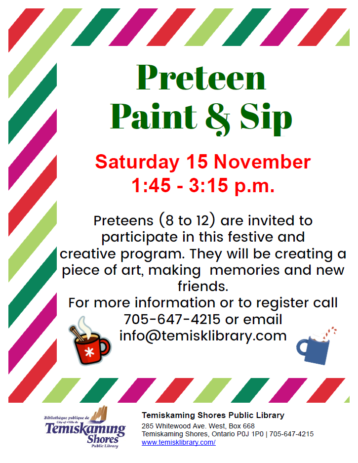 The Temiskaming Shores Public Library is holding a holiday event for our Preteens (8 to 12 yrs). This Preteen Paint & Sip will take place on Saturday November 15th from 1:45 to 3:15 p.m. This festive and creative program will have them creating a...